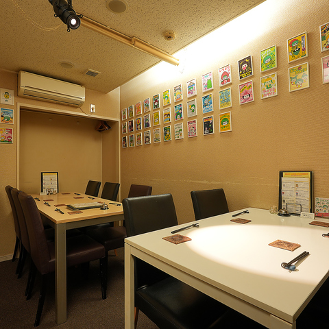 【プライベート感を大切にしたテーブル個室席】個室では6名掛けテーブルと4名掛けテーブルの2卓ございます◎最大12名様まで収容できるため、仲間との集まりや特別なひとときに最適です◎個室の壁には、これまで醸造したビールのイラストが描かれており、視覚的にも楽しめる空間となっています!