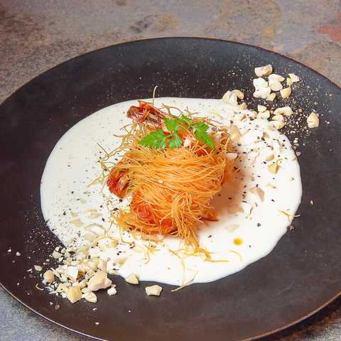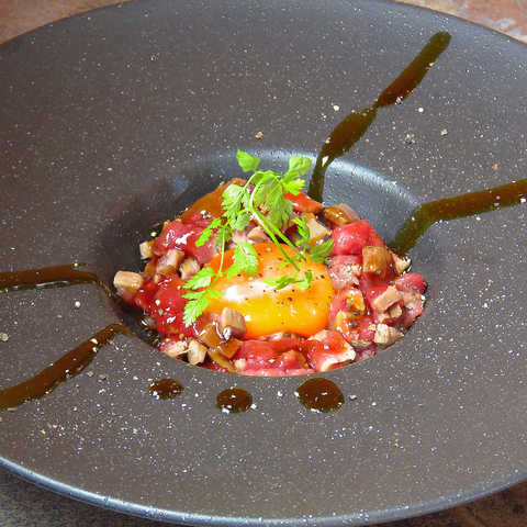 炭火で丁寧に炙った鹿肉のタタキを、濃厚な特製ユッケダレと、深いコクを持つ御養卵に絡めていただく贅沢な逸品です。鹿肉の奥深い旨みと炭の香ばしさが口いっぱいに広がり、とろりとした卵が全体をまろやかに包み込みます。この重厚な味わいには、スパイシーで力強い赤ワインを合わせていただくのがおすすめです。