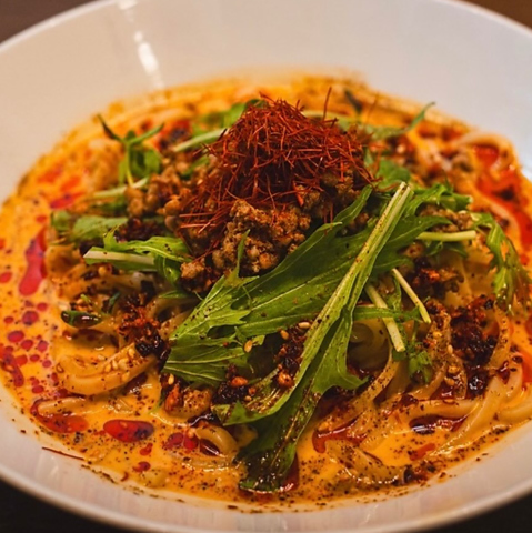食事の〆にはこの一杯!数種類の香辛料をブレンドした自家製麻婆スープは、ピリッとした辛さと濃厚なとろみが特徴です。価格は1,540円(税込)。スープがよく絡むもちもちの自家製太麺は、噛むほどに小麦の風味と麻婆の旨味が広がります。お酒の後でもするりと入る、やみつきになる美味しさをぜひ。