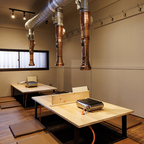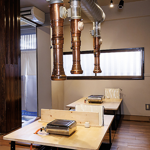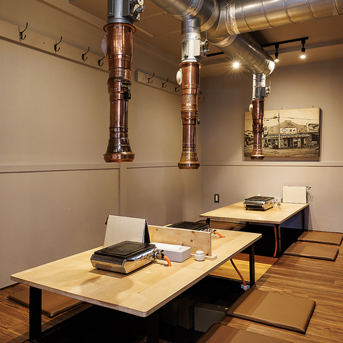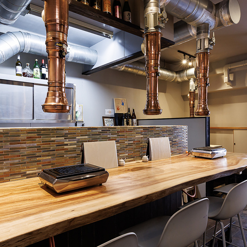 お一人様の気軽なサク飲みやデートにもぴったりのカウンター席♪活気ある厨房を眺めながらのお食事をお楽しみいただけます!洒落た内装は女性お一人でもご入店いただきやすい雰囲気♪各お席ごとに排煙されるため、お仕事帰りの焼肉飲みにもおすすめです!