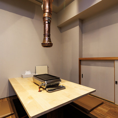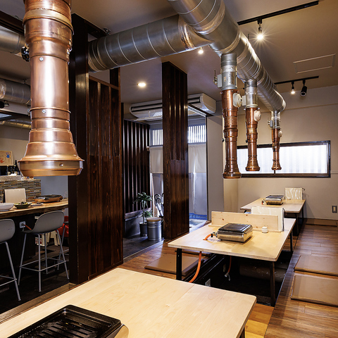 お一人様の気軽なサク飲みやデートにもぴったりのカウンター席♪活気ある厨房を眺めながらのお食事をお楽しみいただけます!洒落た内装は女性お一人でもご入店いただきやすい雰囲気♪各お席ごとに排煙されるため、お仕事帰りの焼肉飲みにもおすすめです!
