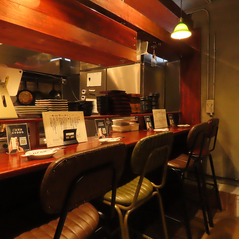 【カウンター席】お1人様でのご利用も大歓迎!お酒がすらりと並ぶお洒落なカウンター席で、おもてなしいたします★単品飲み放題も1名様~ご利用可能ですので、お好みのお料理と合わせて、ぜひご利用ください。間接照明が照らすおしゃれなカウンター席で、デートでのご利用にも◎全席喫煙可です!