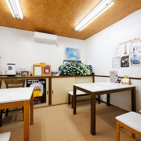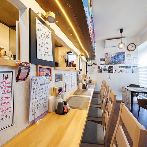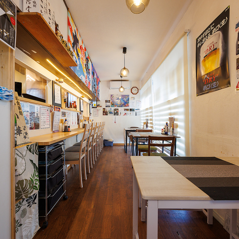 【入って右手はテーブル&カウンター】厨房の活気が伝わるカウンター6席と、2名様掛けテーブルをご用意。DIYで仕上げた木の温もりある内装は清潔感があり、女性のお一人様やランチ利用も快適に過ごせます。WiFi完備で動画を見ながらの食事もOK。仕事帰りのサク飲みや遅めの夕食利用も大歓迎です。