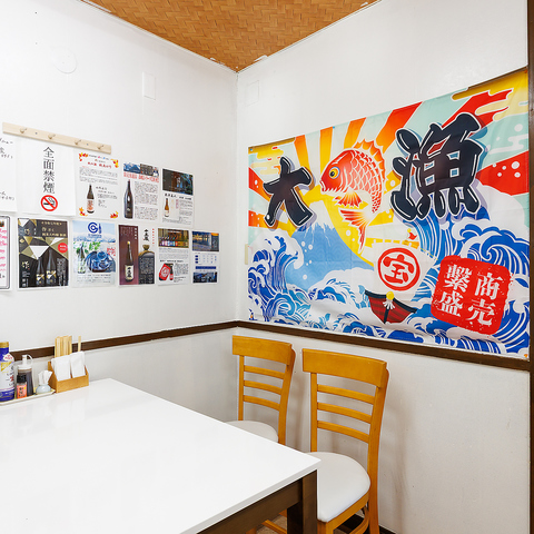 2名様掛けのテーブル席は、カップルやご夫婦、友人との語らいにぴったりの空間です。木目を基調とした明るく清潔感のある店内で、隣り合って食事を楽しめます。