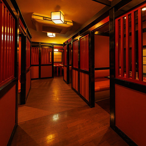 情緒あふれる朱色の壁と木格子が印象的な半個室!程よいプライベート感があり、女子会やデート、合コン、接待にもピッタリ!和モダンな空間で、料理とお酒を心ゆくまでお楽しみいただけます!