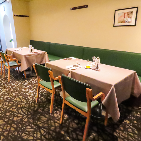 【テーブル席のご用意】フロアごとに異なるイメージカラーを採用しています。緑色が基調のエリアは、リラックスした雰囲気を演出し、心地よいひとときを提供します。また、赤色のフロアでは、温もりと活気を感じながら、会話をお楽しみいただけます♪