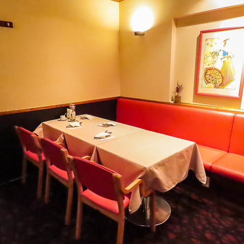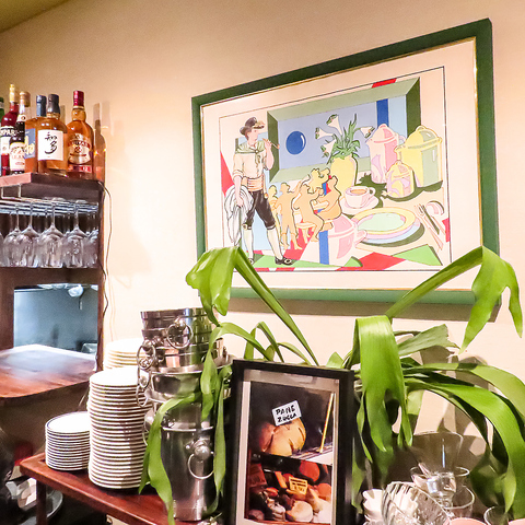 【大切な方との食事に最適】赤色や緑色のソファとシンプルなテーブルが心地よい空間を演出し、友人や家族との会話を楽しむのにピッタリです!アートが飾られた店内で、さらに特別なひとときを彩ること間違いなしです!