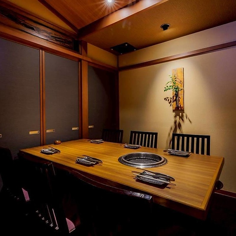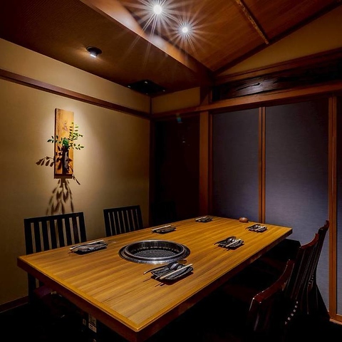 木の温もりあふれる和モダンな個室は、落ち着いた雰囲気の中でゆったりとお食事を楽しめる空間です。周囲の目を気にせず、家族や友人、ビジネスの大切な会話も安心してお過ごしいただけます。接待や記念日、特別ん日にふさわしいプライベート空間で、心ゆくまで上質な焼肉をご堪能下さい。