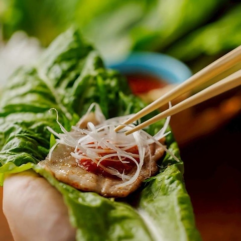 宮城県が誇る銘柄豚「ほろよいとん」を、サムギョプサル風にお楽しみいただける一皿。地元酒蔵の酒粕を加えた飼料で育てられ、脂がまろやかで甘味があり、とろけるような柔らかさ。香ばしく焼き上げた豚肉を薬味や野菜と一緒に包んで頬張れば素材のうまみが口いっぱいに広がります。上質な豚肉の美味しさを、五感で楽しめるメニューです。