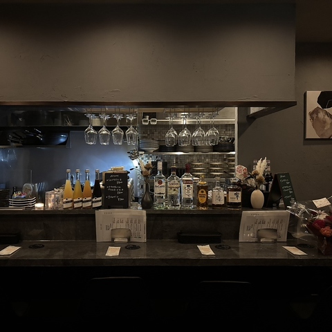 落ち着いたグレーと黒を基調に木目調をアクセントにした空間は、シンプルながらも温かみを感じさせる雰囲気。気取りすぎずカジュアルすぎないバランスで、デートや女子会はもちろん、肩ひじ張らない集まりにもぴったりです。暗めの照明が大人のひとときを演出してくれます。
