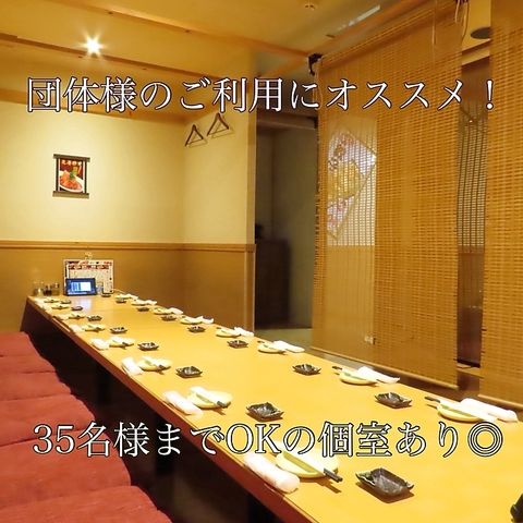 団体様でのご利用にぴったり!最大35名様までご利用いただける広々とした個室をご用意しております◎会社の宴会や同窓会、打ち上げ、送別会など、大人数での集まりに最適な空間です。周囲を気にせず、ワイワイと盛り上がれるプライベート空間で、思い出に残るひとときをお過ごしいただけます。長時間のご利用でも快適です。