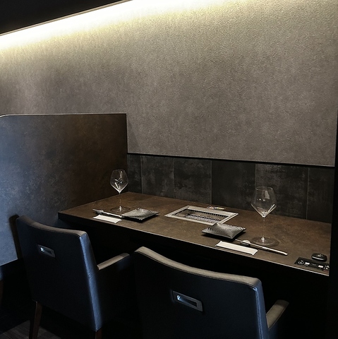 【少人数のお客様も大歓迎◆仕切り付きの快適なカウンター席をご用意】カウンターには2名区切りで仕切りを設置、デートやご夫婦、ご友人との二人きりのお食事に便利です。コンロ付きで肉を焼きながら、横並びの会話も弾みます。