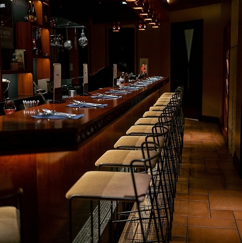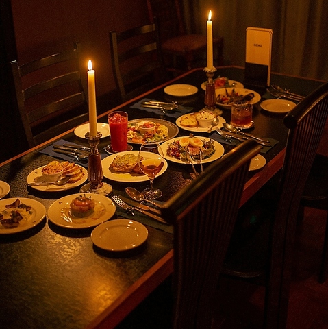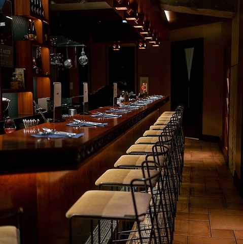 温かい照明や煌めく蝋燭が特別な時間を演出する非日常空間へようこそ◎仕事帰りの一杯やデートに最適な17席のカウンターでは、調理風景を眺めながら出来立ての料理を堪能できます♪広々としたアールデコ様式のダイニングテーブル席は、4~8名様の会食にぴったりです。