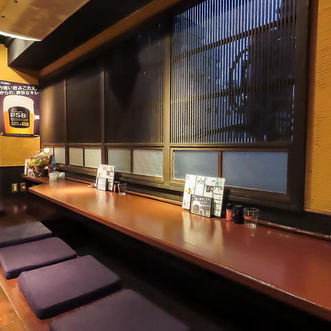 香ばしい焼き鳥の香りが漂うカウンター席。静かに日本酒を味わえる掘りごたつ空間はおひとり飲みにも最適