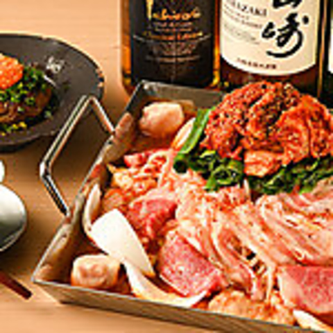 希少価値の高い大阪産 銘柄和牛『なにわ黒牛』と『大阪泉州 犬鳴豚』を贅沢に使用し、大阪直送の新鮮なホルモンや野菜の入った鉄板鍋になります。旨みたっぷりのお肉と新鮮な野菜、深い味わいをご堪能いただける逸品になります。