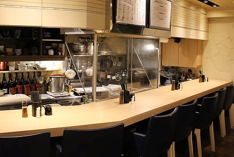 調理風景を目の前で楽しめるカウンター席をご用意しております。お料理が出来上がる音、香りなど、五感で楽しむことができます◎。お一人様でも気軽にご利用いただけますので、お仕事帰りの一杯にもどうぞご利用ください。