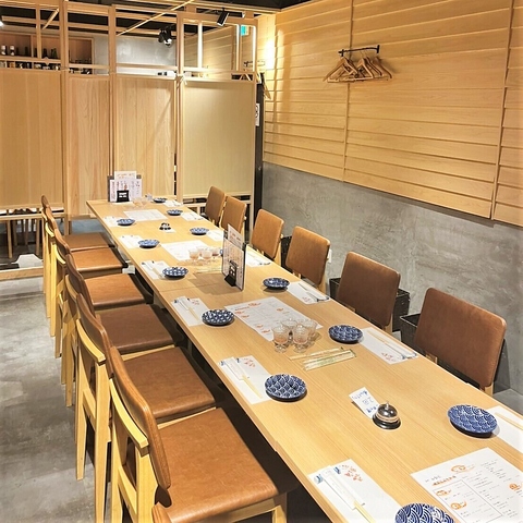 《大人数個室》木の温もりを感じる落ち着いた雰囲気で、仕切りが設けられているため、グループごとのプライベート感も確保されています。宴会や会社の集まり、家族や友人同士での食事にも最適な空間です。静かに会話を楽しみたい方にもおすすめで、長時間の滞在でも快適にお過ごしいただけます。大人数でのご利用も安心してお任せください。
