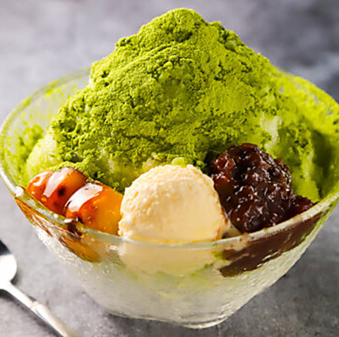 食事の〆には、とろけるような口当たりのふわふわかき氷(抹茶)がおすすめです!まるで雪のようなきめ細やかな氷に、香り高い抹茶シロップをたっぷりと◎トッピングのバニラアイス、つぶあん、黒蜜と混ぜて食べると、口の中で様々な食感や風味のハーモニーが楽しめます。クールダウンさせてくれる、当店一押しのデザートです♪