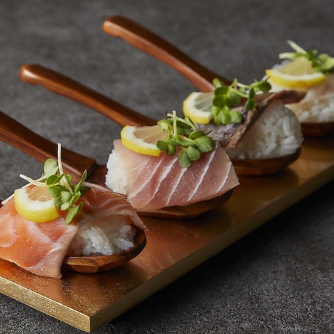 れんげ寿司 四種盛り合わせ鮮魚と酢飯をひとくちサイズで。レモンとスプラウトが爽やかに香る贅沢な逸品♪ひと匙に込めた、海の至福。繊細な握りをれんげにのせて、優雅に味わう至極の一口寿司。