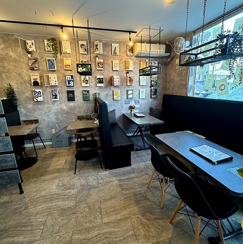 アートと植物に囲まれた癒しの空間。モダンで落ち着いた店内は、ランチやカフェタイムにぴったり。