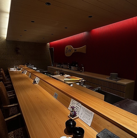 宮島駅から徒歩5分。隠れ家のように佇むお店の扉をくぐれば、そこには非日常的な空間が広がります。高級感の溢れる一枚板のカウンター席で味わう料理はいずれも絶品。職人技が織り成す『鮨×イタリアン』のマリアージュにどっぷりと浸るひとときをお過ごしください。