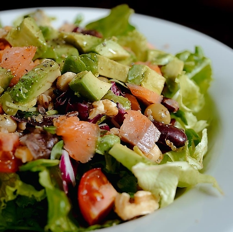 肉に自信、野菜にも本気。旬の彩りを刻んだ「お任せチョップドサラダ」850円。食感も栄養も、これ一皿で。