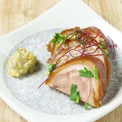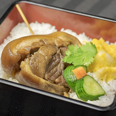 滷蹄膀(ルーティーパン)とは 豚の上の付け根の肉のことで、骨つきの皮ごと脂身の肉が多い特徴の食材です。これをルーシュイというたれに漬け込んで煮込む料理です◎