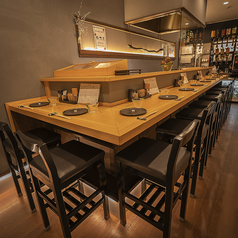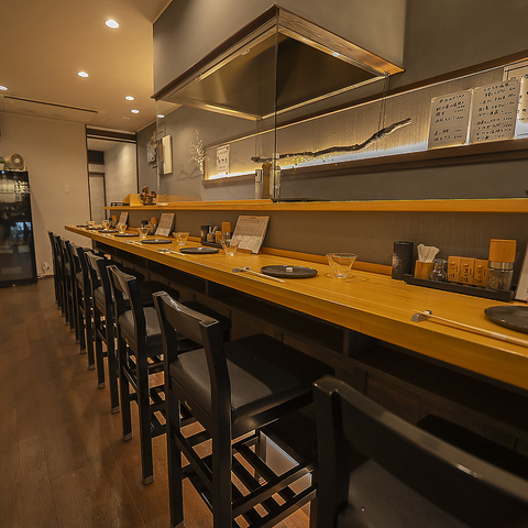 全席カウンターの当店では、目の前で繰り広げられる店主の巧みな技を楽しみながら、紀州備長炭で丁寧に炙り上げた極上の一品料理を堪能できます。旬の食材を使用した料理は、香り、音、そして味の全てで魅了します。落ち着いたシックな空間は、デートや家族との集まり、接待にもぴったり。特別なひとときを、心ゆくまでお楽しみください。