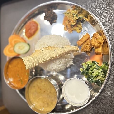 チキンカレーやライス、サラダに加え、ダル(豆スープ)やパパド、アチャールなどネパールの伝統料理を網羅した豪華なセット。