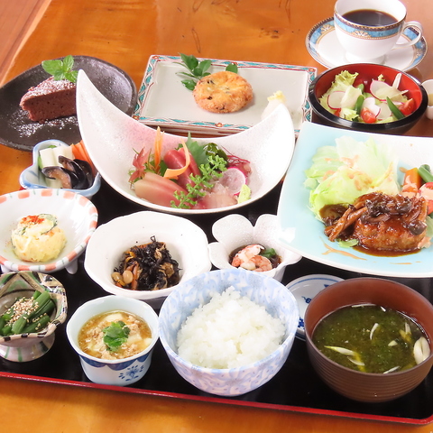 ランチにお召し上がりいただける『ほしの宴御膳』は日替わりの小鉢6種類と選べるメインなどがセットになったボリューム・栄養満点のメニューです!メインは肉、魚など3~4種類からお選びいただけます◎自家製がんもやポテトサラダ、畑でとれた旬の野菜を使った小鉢は体を癒す優しい味付けで提供します!※デザートは別料金