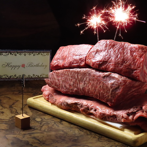 誕生日などのお祝いにご要望がございましたら肉ケーキや肉プレートなどをご用意いたします