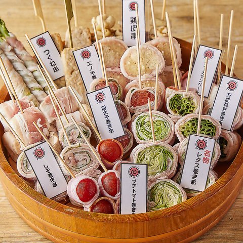 うずまきでしか食べられない!?食材達の一期一会を料理で表現♪料理長の遊び心が詰まった名物料理をご堪能してください!季節限定串・プチトマト巻・レタス巻・しそ巻・万ネギ巻・豚バラ串・鶏皮串etc...コスパ良し!ビールにもハイボールにも焼酎にも合う逸品です♪