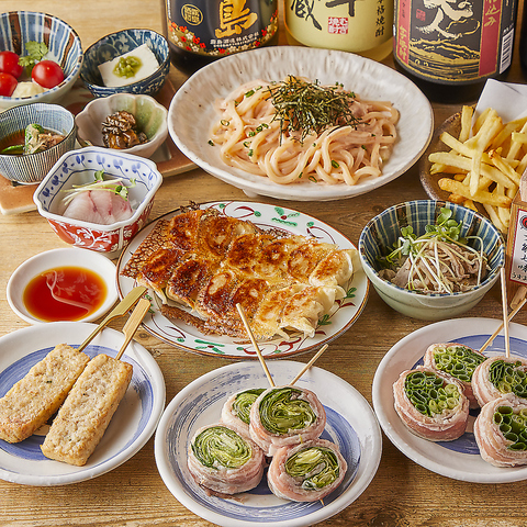 忘年会にもピッタリ♪名物野菜巻き串×博多一口餃子飲み放題付コースご用意♪博多牛もつ鍋付きコースも