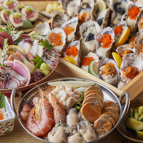 名物「殻付き生牡蠣」が90分食べ放題!さらに、胡麻カンパチ・カキフライ・塩唐揚げ・明太焼きおにぎりなど、牡蠣好きも大満足の全8品に2時間飲み放題付き6000円コースや、看板メニューをすべて味わえる贅沢コースまで!飲み会、歓送迎会などのご宴会にもおすすめ!