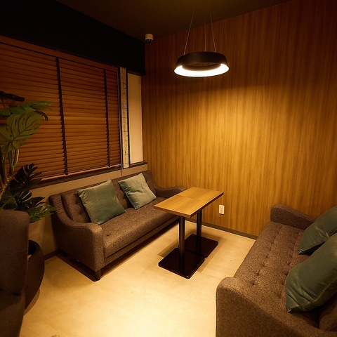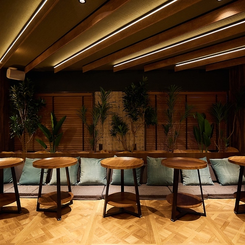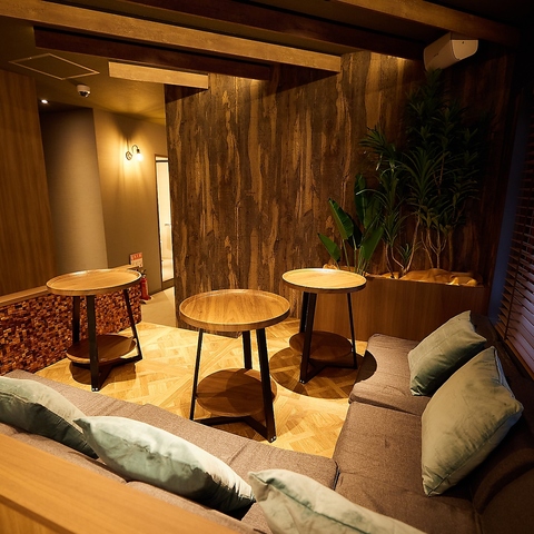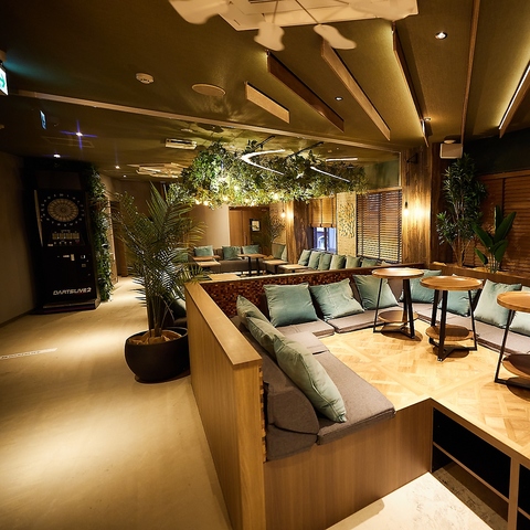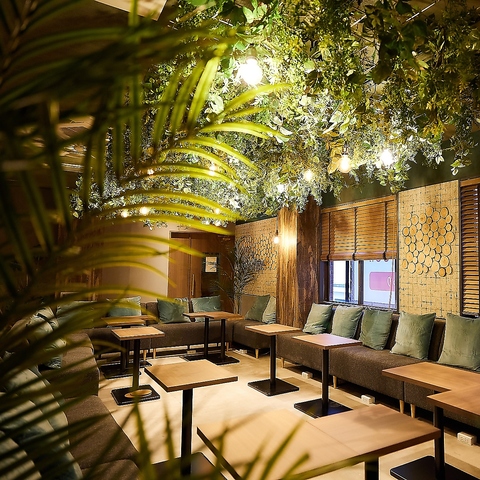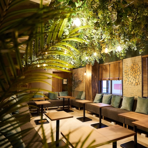 【緑の癒やしエリア】天井一面を覆う緑と木漏れ日のような照明が、まるで森の中に迷い込んだような非日常を演出します。広々としたソファー席でクッションに身を委ねれば、都会の喧騒を忘れて心からリラックスできます。デートや女子会、ゆったりと会話を楽しみたい夜に最適な癒やしの空間です。