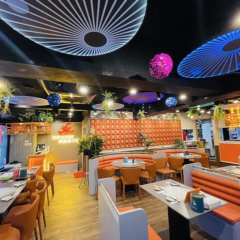 オレンジ色のソファー席と、遊び心のある照明が目を引く清潔感のある店内です。2名様用のテーブル席から、大人数で利用できる円卓までご用意しており、デートや友人との食事、会社の宴会など様々なシーンでご利用いただけます。