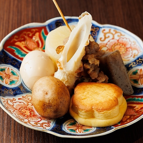 ≪昆布×鰹×鶏≫を独自にブレンドした出汁で煮込んだおでんは、牛すじや骨付き鶏、自家製練り物など、多彩な具材と絶妙に調和しています。名物のだし巻き煮込みは、日本酒との相性も抜群です。定番の具材はもちろん、牛モツや旬の野菜などの変わり種もご用意しており、季節ごとのメニューもお楽しみいただけます。