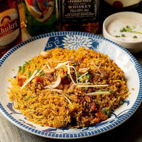 チキンビリヤニは、香り豊かなスパイスとジューシーな鶏肉が絶妙に絡み合った伝統的な料理です。サフランで色付けされたご飯と、ナッツのトッピングが食欲をそそります。一口食べれば、豊かな風味が広がって心も満たされること間違いなし!ぜひ一度味わってみてください♪
