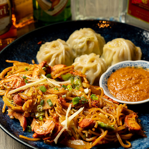 ネパール風スパイスが香るもちもち焼きそばと、ジューシーな餃子が一緒に楽しめるセット♪ランチや小腹満たしにもぴったりで、楽しく美味しくアジアの味を満喫できちゃいます!