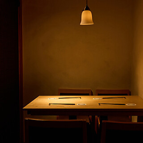 完全個室はございませんが、周囲から区切られた半個室タイプのお席をご用意しております。落ち着いた照明と柔らかな光を灯すペンダントライトが、プライベートな雰囲気を演出。デートや接待など、周囲を気にせずゆっくりとお過ごしいただけます。