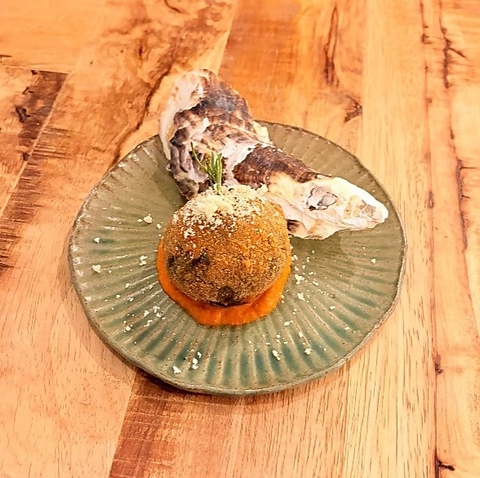三陸産牡蠣とイカスミのライスコロッケ。特製のロメスコソースで。こちらは1人1個を是非!
