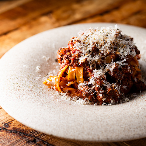牛肉の旨みたっぷりの贅沢ミートソースに、チーズをドサッとかけて
