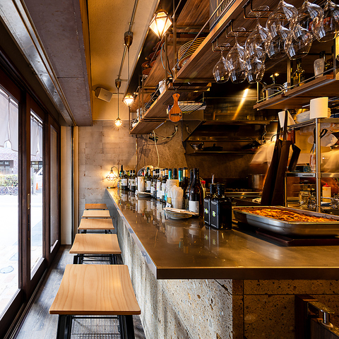 カウンター席から眺める事の出来るオープンキッチン。本格的なパスタや前菜、旬の食材を使った一皿まで、肩肘張らずに楽しめる“イタリアン酒場スタイル”!