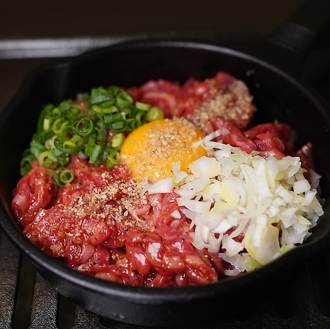 スキレットで焼きながら食べるユッケは他ではなかなか食べれないスタイルの当店のスペシャルメニュー。土鍋で炊いたご飯との相性は言わずもがな最高の組み合わせです。