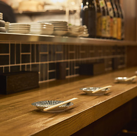 木の温もりを感じる落ち着いたカウンター席は、1人飲みにもぴったりの特等席。目の前で仕上がる臨場感が◎