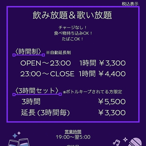 | 営業時間 | 月~土、祝前日: 19:00~翌5:00 (料理L.O. 翌4:00 ドリンクL.O. 翌4:00) |