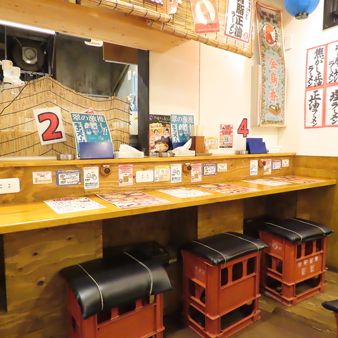 目の前で調理のライブ感が楽しめる特等席!お一人様や、飲んだ後の〆にも最適なカウンター席です。職人が真心を込めて作る一杯を、熱々のうちにサッと堪能できます。どなた様も気兼ねなく、ラーメンと向き合う至福のひとときをお過ごしください。