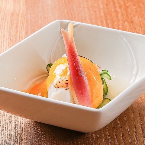 旬の野菜を色鮮やかに盛り合わせ、香り豊かな山椒味噌でいただく一皿。噛むほどに広がる野菜の甘みと、山椒の爽やかな辛みが調和し、後味はすっきり。素朴でありながら奥深い味わいを楽しめる、料理人こだわりの逸品です。