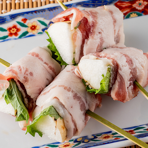 新鮮な野菜を一本一本丁寧に豚肉で巻き上げ、炭火で香ばしく焼き上げた自慢の「野菜巻き串」。ジューシーなお肉の旨味と、シャキッとした野菜の食感が絶妙に重なり、さっぱりとした味わいながら満足感のある逸品です。彩りも美しく、ヘルシー志向の方からお酒好きの方まで幅広くお楽しみいただけます。