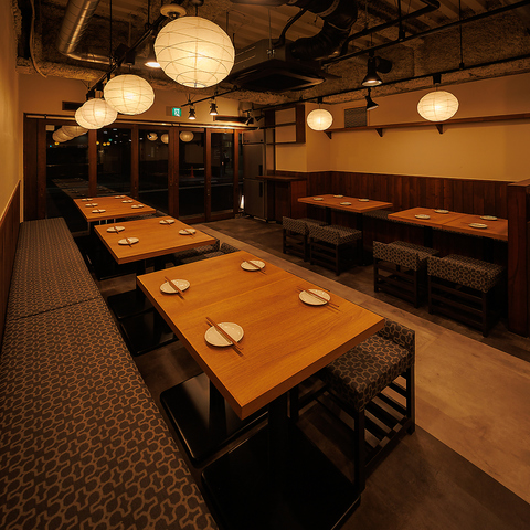 【デートなどにも..】和をテイストとした木目調な店内は、落ち着いた雰囲気になっており、ゆっくりとお酒を楽しんでいただけます!窓側はソファー席になっており、2名様でご利用いただけるテーブル席はデートにもおすすめ♪また、壁面はガラス張りになっておりますので、開放感も抜群です♪